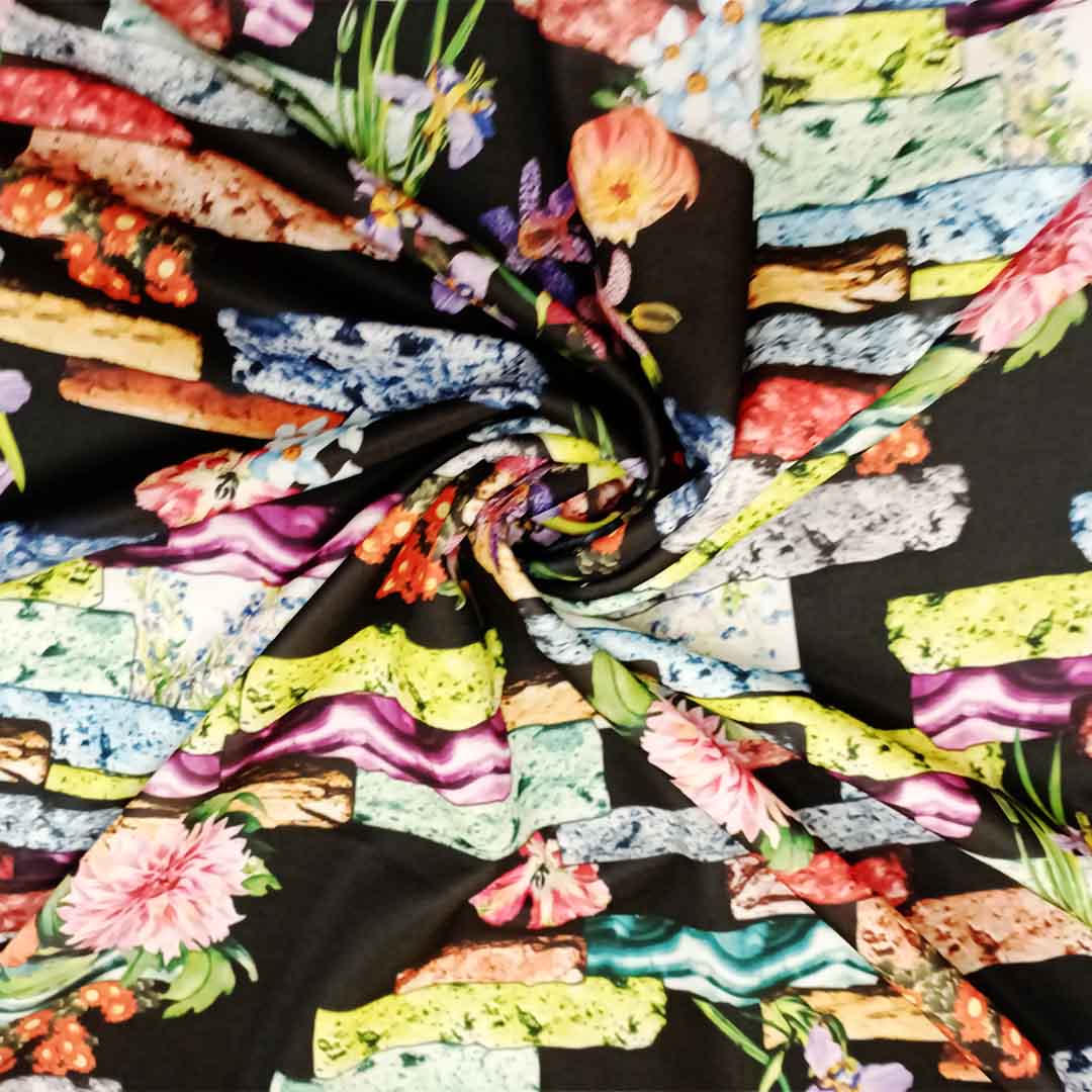 Introducing the Scuba Digital Print Black Bricks & Floral, a stylish and bold fabric that blends a contemporary brick design with soft, intricate floral patterns. The striking contrast between the dark brick backdrop and the vibrant florals adds sophistication and drama to any project. Perfect for fashion, home décor, or upholstery, this fabric offers versatility and modern flair.