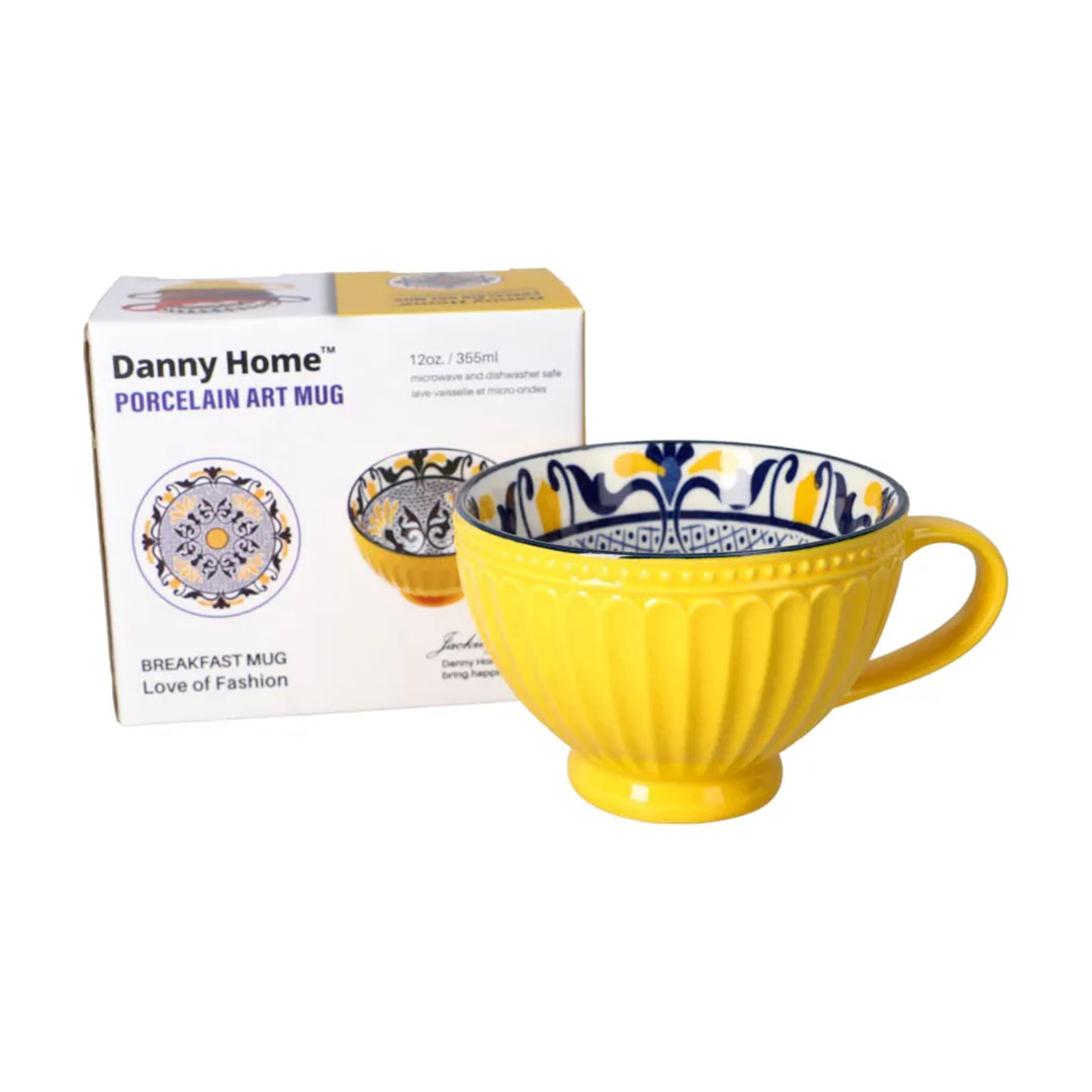 Inside, a delicate patterned print stretches along the walls. Swirly motifs intertwine with geometric shapes, complimenting the yellow exterior. The pattern becomes visible with each sip, adding a touch of elegance and surprise to the drinking experience. Whether filled with tea or coffee, the print adds a layer of charm and artistry.