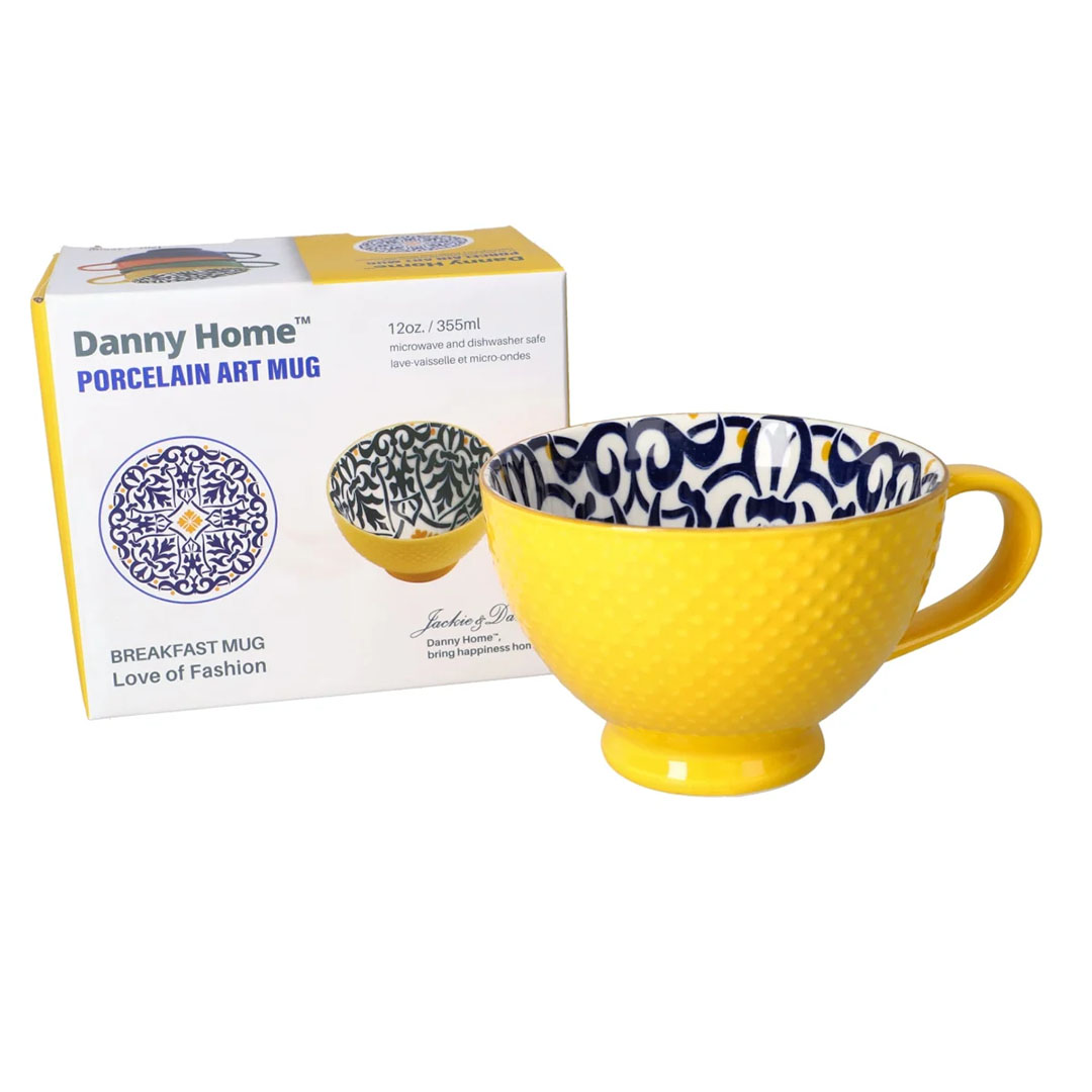 Inside, a delicate patterned print stretches along the walls. Swirly motifs intertwine with geometric shapes, forming a subtle contrast to the solid yellow exterior. The pattern becomes visible with each sip, adding a touch of elegance and surprise to the drinking experience. Whether filled with tea or coffee, the print adds a layer of charm and artistry.